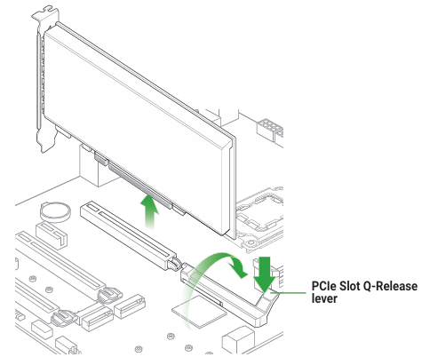 Q-Release is a new eject mechanism for ASUS motherboards with PCIe slots. You can refer to the following steps to unlock the latch of the PCIe slot and easily install or remove the graphics card in the PCIe slot.