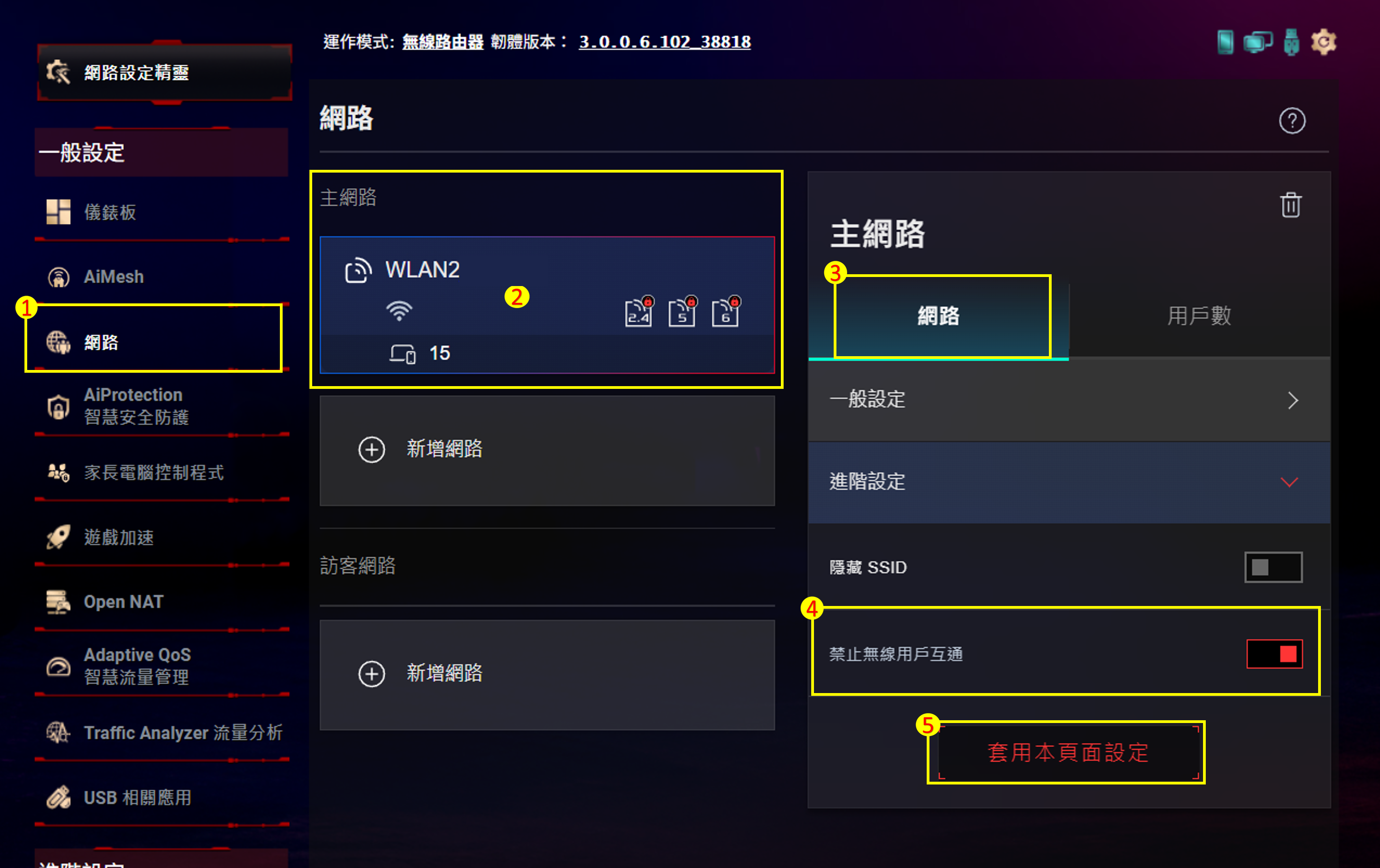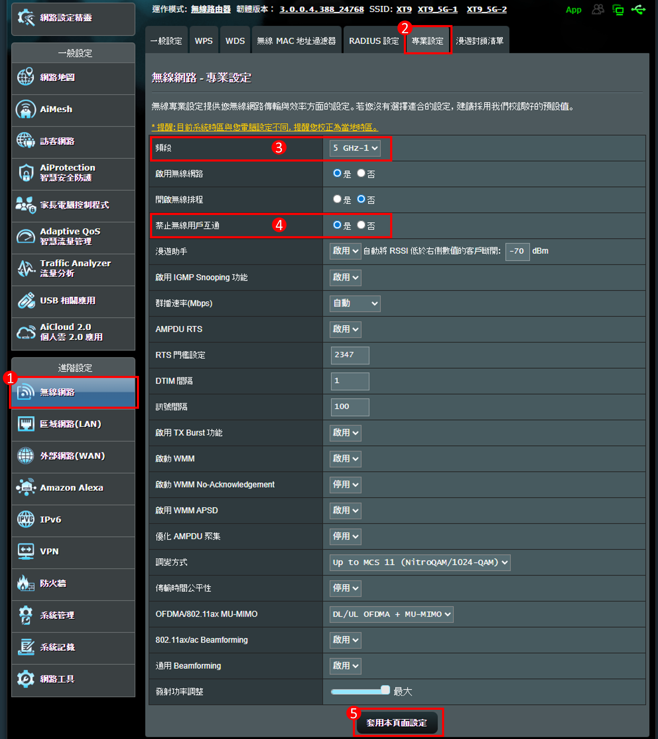 4. 在進階設定啟用[禁止無線用戶互通],然後點選 [套用本頁面設定]儲存設定即完成。