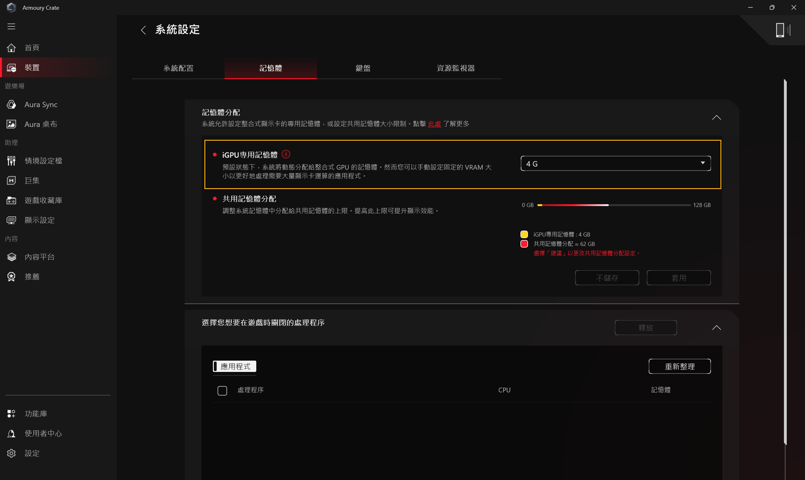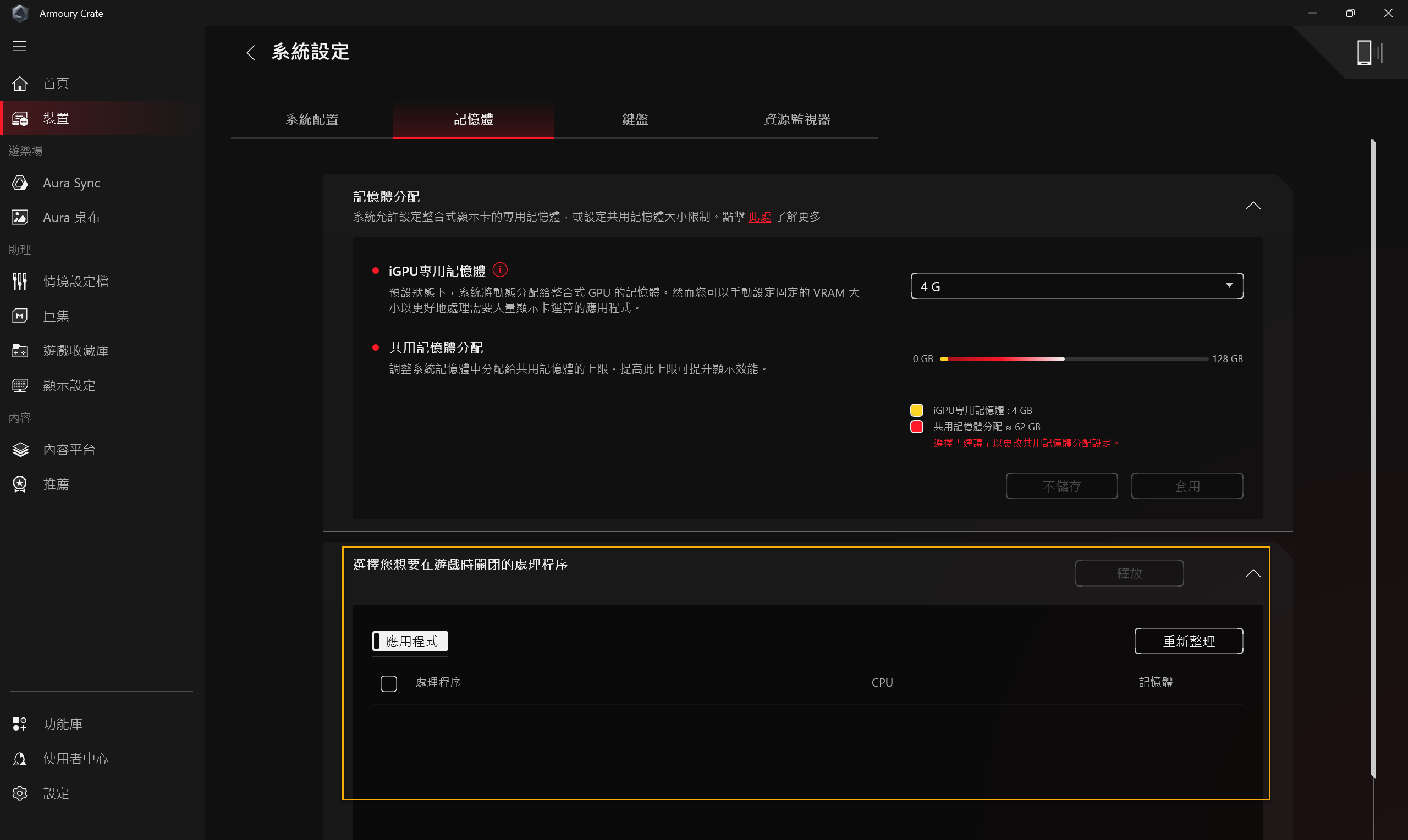 玩家可以選擇遊戲時想要停止的應用程式,透過關閉程式來釋放被佔用的記憶體。