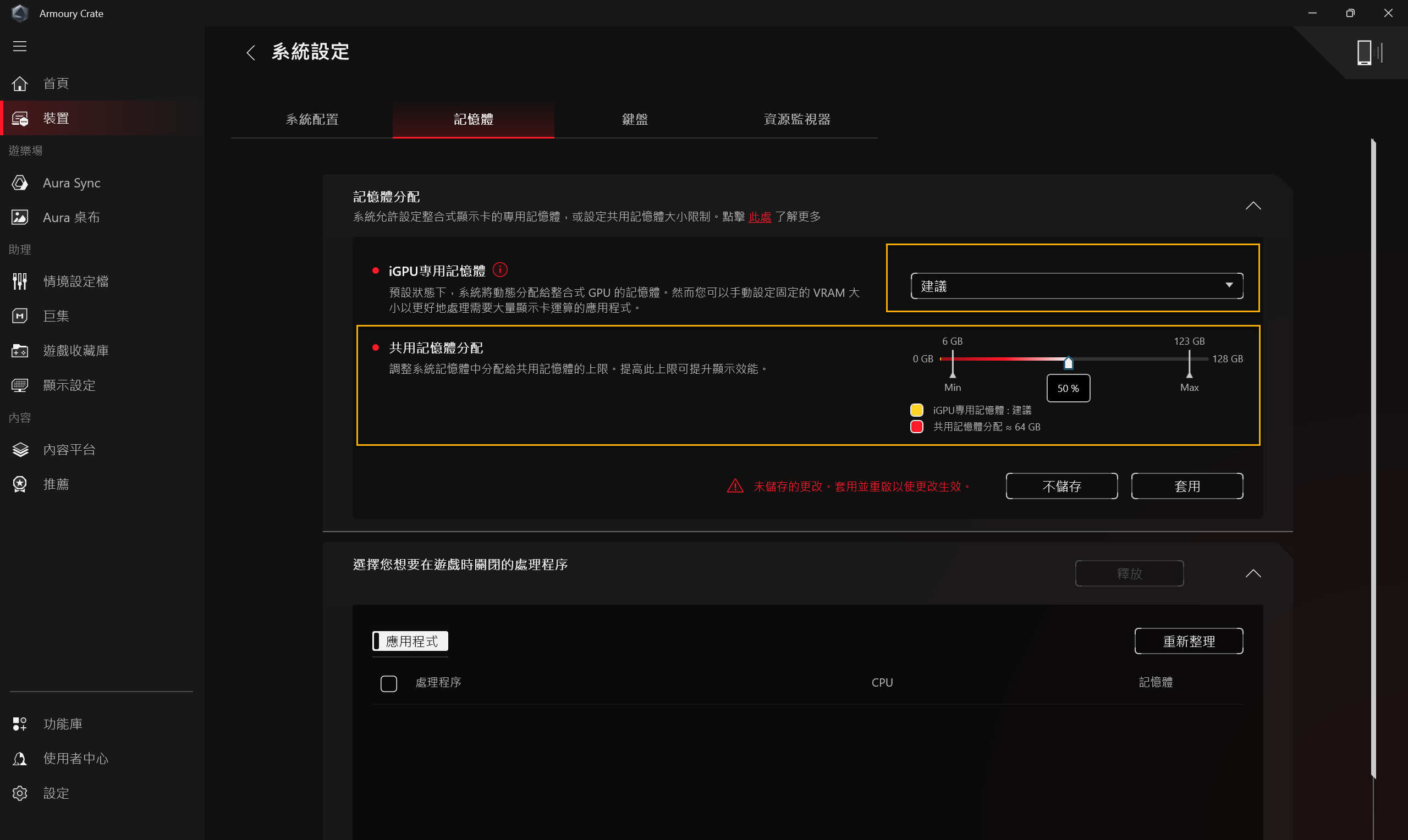 *將[iGPU專用記憶體]設定為建議時,你可以更改共用記憶體分配的設定。
