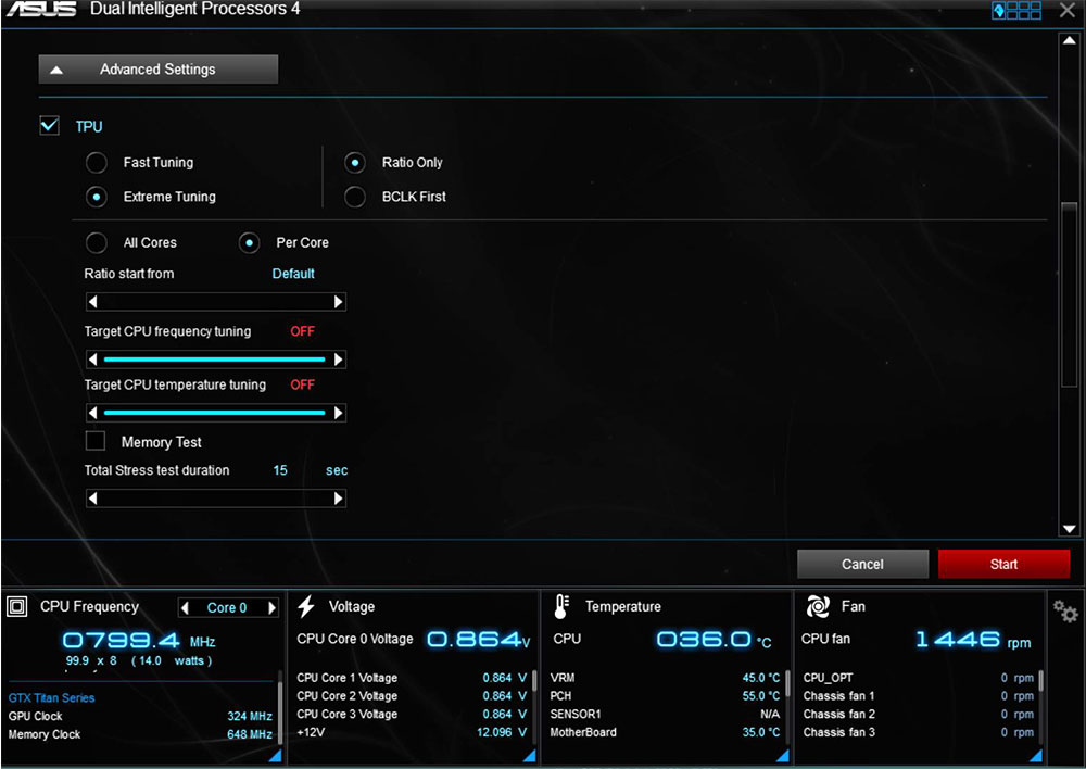Starting with the Turbo Processing Unit (TPU), 5-Way Optimization performs Auto Tuning, which automatically overclocks the CPU to within ~95% of its potential, a process that typically could take up to 2 days to manually overclock. Alternatively, Auto Tuning can also be configured to target a specific frequency or temperature threshold.