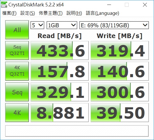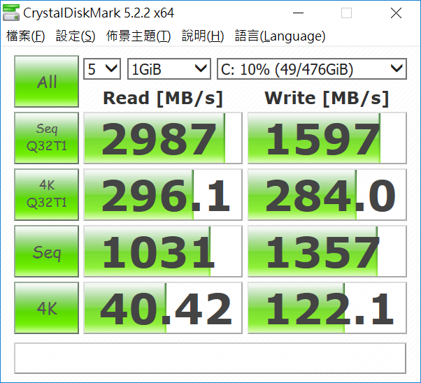 ▲ 採用NVMe的系統碟果然跑分不惶多讓,在循序讀取可接近3GB/s,而寫入則有1.5G的實力,在4k Q32T1方面也有300MB以上的表現。